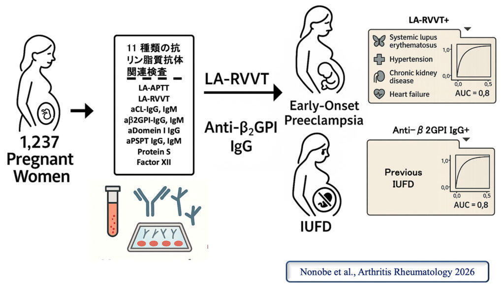 最近、妊娠中に11種類の抗リン脂質抗体を調べ、その妊娠結果の異常を解析しました(文献14)。ループスアンチコアグラント希釈ラッセル蛇毒法は妊娠高血圧腎症の危険因子であり、抗β2glycoprotein I IgGは子宮内胎児死亡の危険因子であることがわかりました(図4)。そのほかの検査の効果はありませんでした。
