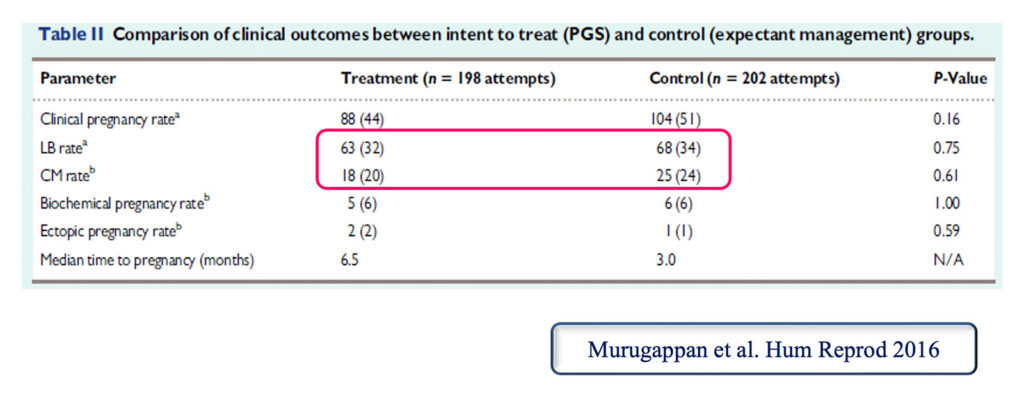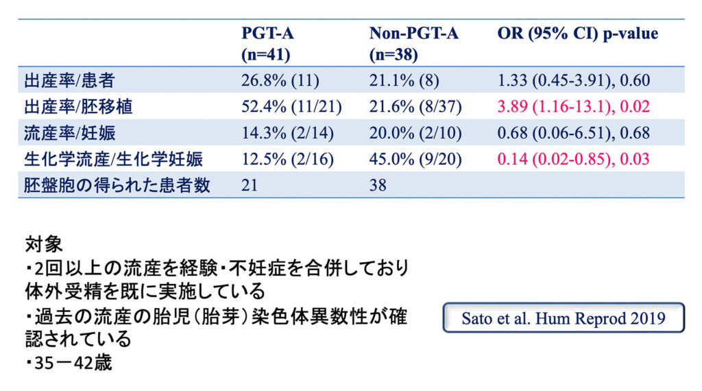 PGT-Aは理論的に出産率がよくなりそうに思えますが、2007年には、高齢不妊女性を対象とした無作為割り付け試験によって出産率が悪くなることがわかりました。生検(細胞を採取)によるダメージによって妊娠率が低下するためです。その後、生検、診断技術が向上しましたが、未だに習慣流産(不育症)において出産率改善は証明されていません。