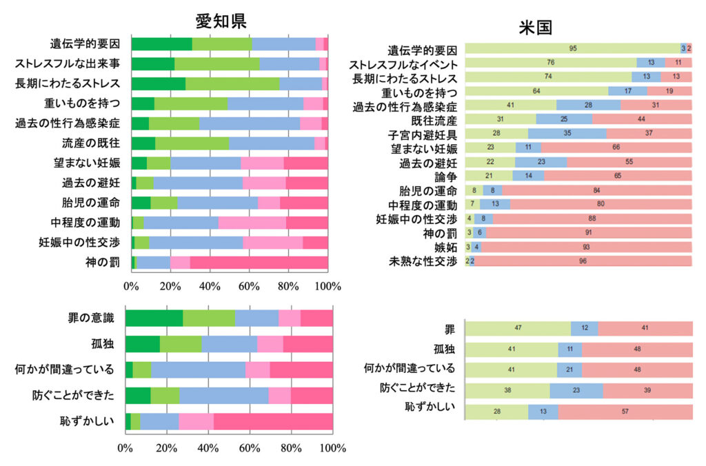 しかし、患者さんも含めて流産の原因は適切に知られていません。私たちが1,219人を対象として行った愛知県民調査では、流産の原因を「染色体異常などの遺伝学的要因」と回答したのは非常に・ほぼあてはまるを含めて62%であり、米国人よりも正答率は低い結果でした(図13、左愛知県民、右米国調査、文献45)。「長期にわたるストレス」、「ストレスフルな出来事」、「重いものを持つ」を当てはまると答えたのはそれぞれ 75%、65%、49%でした。これらは流産の原因だと証明されていない間違いです。また、65%が流産の頻度を実際の15%より低いと回答しました。流産経験のなかには流産したことを罪に感じ、防ぐことができたと考えている人もいました。